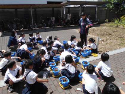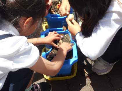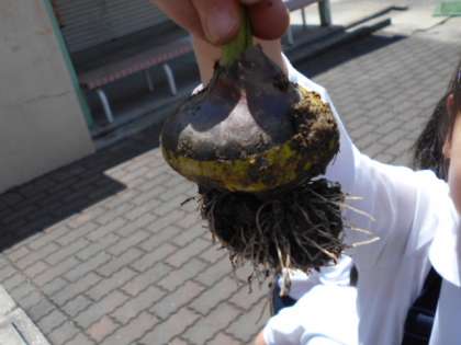 生活科の時間に学習園で去年育てたチューリップの球根をぬきました。立派な球根が育っていました。
