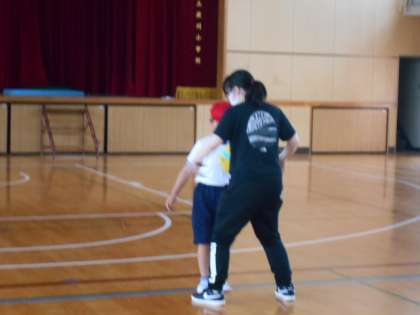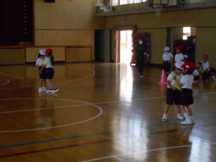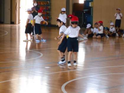 友達と協力してボールを運ぼう!お腹や背中にボールを挟んでコーンまで進みます。