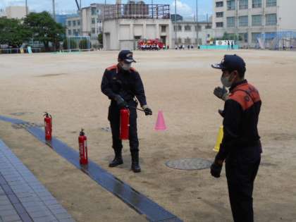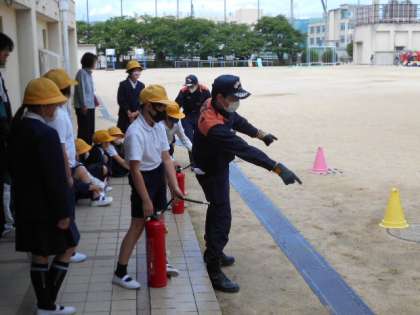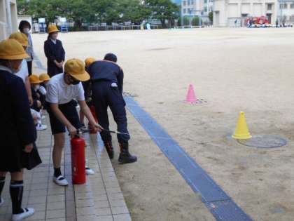 いざ、火災が発生した時は、初期消火が非常に重要です。3・4年生では、消火器の使い方を教えてもらいました。