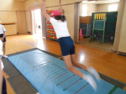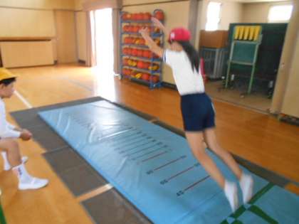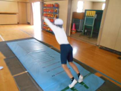 立ち幅跳びです。立ち幅跳びは、跳躍力測定するテストです。足や腕をしっかりつかってとびます。