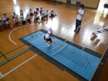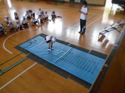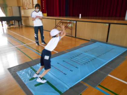 1年生が体力テストに取り組んでいました。写真は、立ち幅跳びに挑戦しています。遠くへとべたかな!?