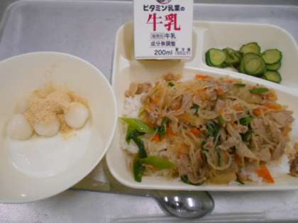 今日の給食は、豚丼、きゅうりの梅風味、白玉だんごのきな粉がけ、牛乳です。給食当番は服装を整えて、衛生的に給食の準備をしましょう!