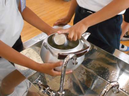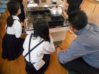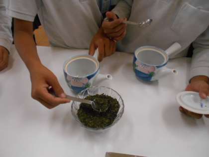 「お茶をいれてみよう」の学習です。お茶は日本の伝統的な飲み物です。適切な湯の温度や茶葉を蒸らす時間など、基本的なお茶の入れ方を身に付けることで、おいしくお茶を入れることができます。ガスコンロや用具の安全な使い方も学びました。