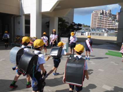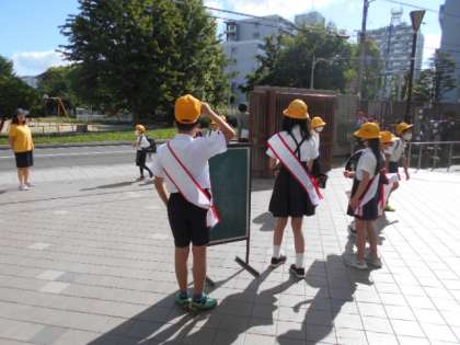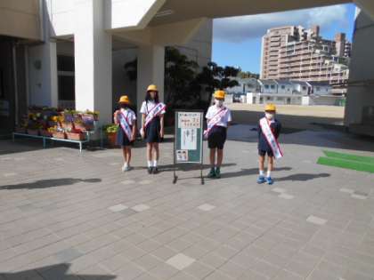 今日のあいさつリーダーさんは5年2組の子どもたちです。朝、正門で元気に笑顔で挨拶しました。