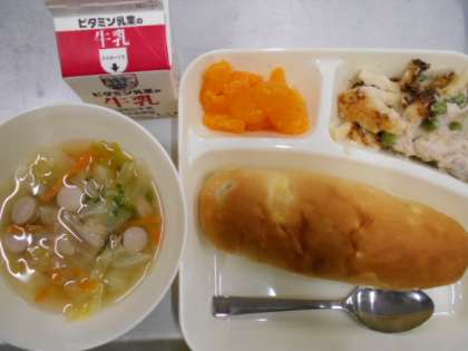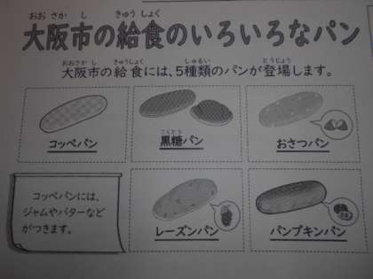 今日の給食は、マカロニサラダ、キャベツのスープ、みかん(かんづめ)、おさつパン、牛乳です。大阪市の給食には、いろいろなパンが登場します。↓