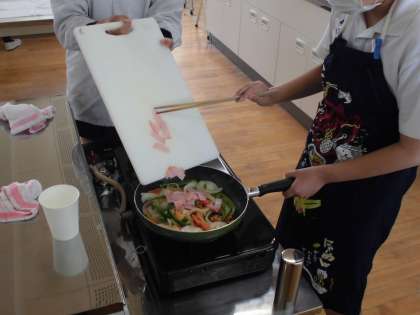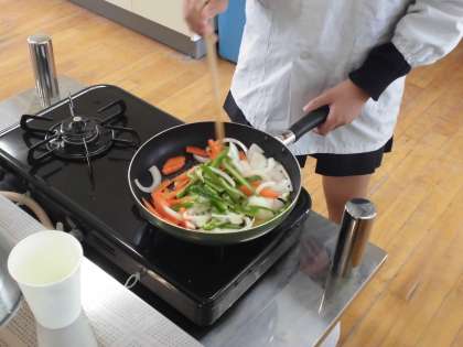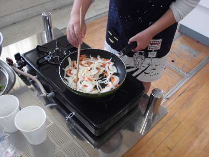 切った具材をフライパンで炒めていきます。お家でもお手伝いをしているのかな!?上手にフライパンを使っています。いい匂いがしてきました。