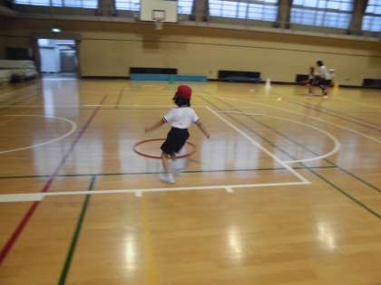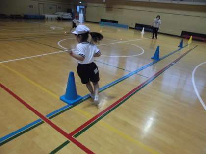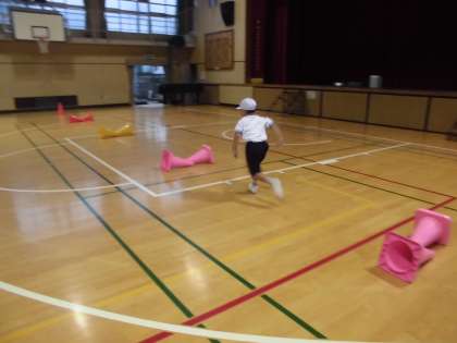 外は大雨ですが、体育館では1年生が元気いっぱい運動しています。サーキットトレーニングで、飛び越したり回ったりジグザグに動いたり… いろいろな動きに取り組みました。