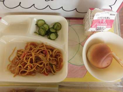 1/2黒糖パン、牛乳、カレースパゲティ、きゅうりのピクルス、棒チーズです。きゅうりはあたたかい気候でよく育つ野菜です。ハウス栽培でもつくられるので、冬でも食べることができます。6月から10月にかけてたくさんとれる野菜です。