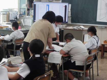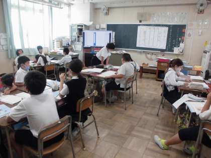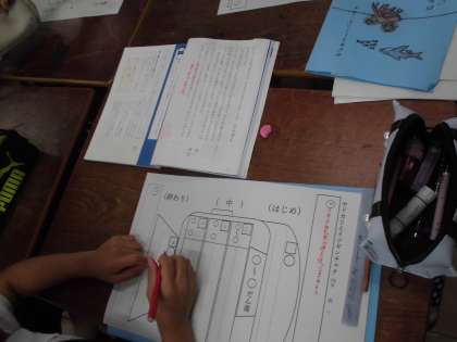 「ヤドカリとイソギンチャク」の学習です。文章全体を読んで「魚の図」のワークシートにまとめていきます。どんな風にまとめたか、グループで話し合います。