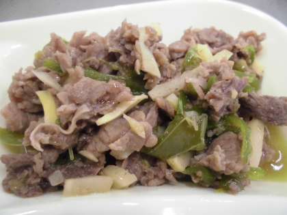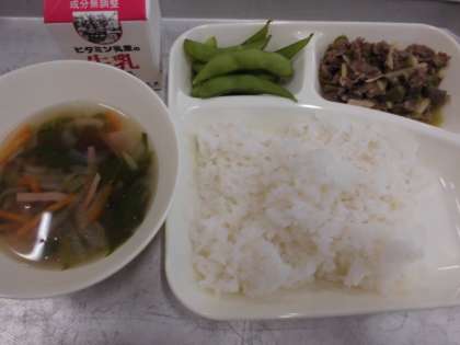 今日の給食は、チンジャオロースー、ハムと野菜の中華スープ、えだまめ、ごはん、牛乳です。チンジャオロースーは、ピーマンと牛肉を細く切って炒めた中国の料理です。中国語で「青椒」はピーマン、「ニューロウ」は牛肉、「スー」は、細切りという意味です。牛肉とピーマンやたけのこなどをいため、砂糖やしょうゆ、オイスターソースなどで味つけしています。、