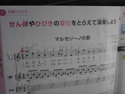 「マルセリーノの歌」です。旋律や響きの変化をとらえて合奏しました。
