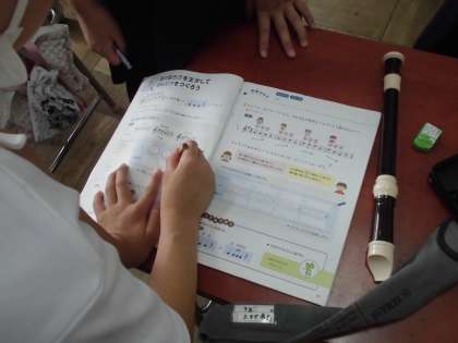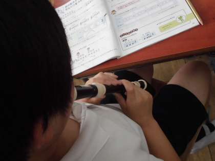 「音の動き方を生かして旋律を作ろう」の学習です。リコーダーで高くなったり、低くなったりする音の動き方に注目して、つくった音型を友達とつなげながら吹きました。