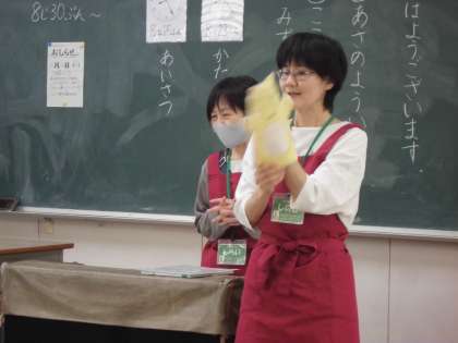 まずはあいさつで、手遊びをしました。まずはかわいい指人形でごあいさつです。その後は、絵本の読み聞かせをしてもらいました。