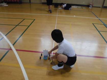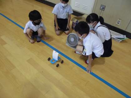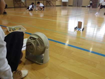 「風の強さと車が動く距離」の学習です。サーキュレーターの風の強さを、だんだんとつよくすると、車が動く距離はどうなるのでしょうか?体育館で実験しました。
