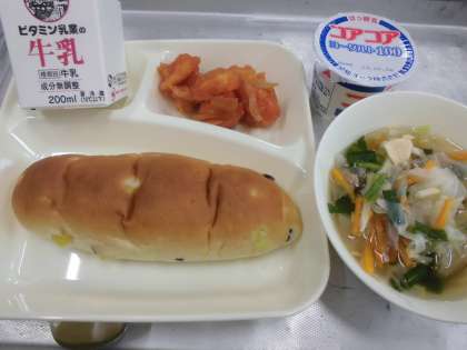 今日の給食は、えびのチリソース、中華スープ、おさつパン、牛乳、ヨーグルトです。えびのチリソースのえびは、主に体をつくるもとになる赤のグループの食べ物で、たんぱく質がたくさん含まれています。また、ほねや歯をつくるもとになるカルシウムも含まれています。