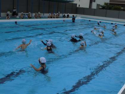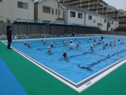雨はギリギリセーフで、1年生のみプールに入ることが出来ました。プールの学習にも少し慣れてきたようで、元気に楽しく取り組むことが出来ました。