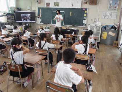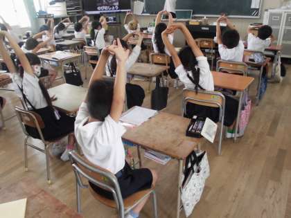 淀川小学校オリジナルの姿勢体操に取り組んでいます。座りながらしっかりと体を動かして頭も体もスイッチオンです。