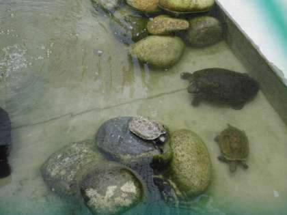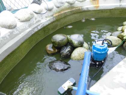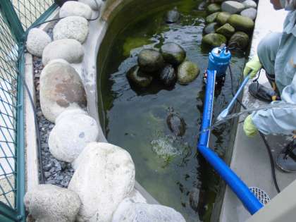 暑くなってきて、亀池の水が濁るスピードもはやくなってきました。管理作業員さんが掃除をしてくださり、とてもきれいになりました。亀もうれしそう〜