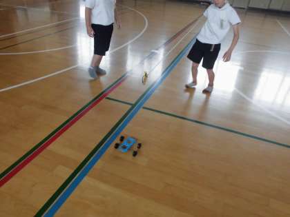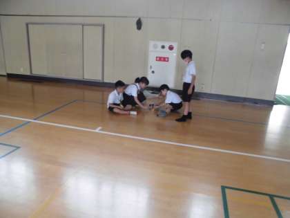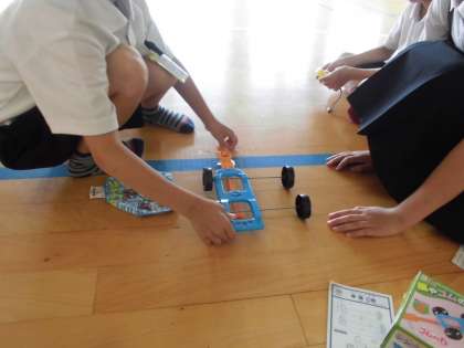 ゴムの力の学習です。引っ張る力を変えると車はどれだけ進むのかについて、体育館で実験しました。
