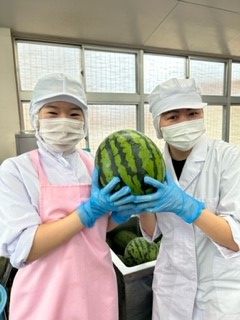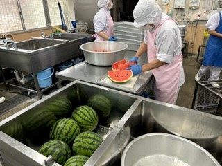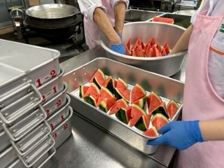 今日の給食には、鳥取県産のすいかがでます。大きなスイカを給食調理員さんが一つずつ切ってくださっています。ありがとうございます。