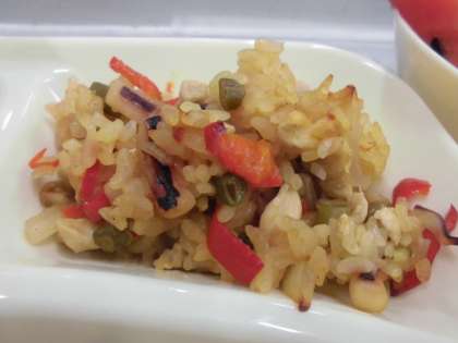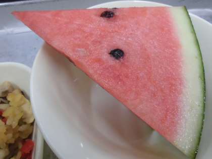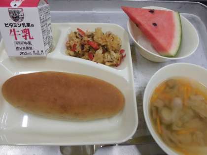 今日の給食は、パエリア、ウインナーとキャベツのスープ、黒糖パン、すいか、牛乳です。今日の給食のパエリアに入っている赤ピーマンは、トウガラシの仲間で、緑色のピーマンが畑で完全に熟すまで待ってから収穫します。赤ピーマンは、緑色のピーマンに比べると甘みがあり、栄養もたくさん含まれています。