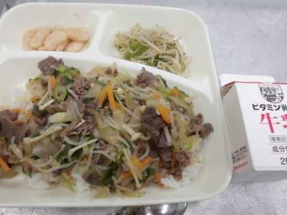 今日の給食は、牛丼、もやしとピーマンのごまいため、大福豆の煮もの、牛乳です。