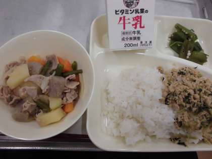 今日の給食は、豚肉とじゃがいもの煮物、オクラの梅風味、ツナっ葉いため、ごはん、牛乳です。オクラは、切り口が星のような形をしていて、独特のぬめりが特徴です。ビタミンやカルシウム、食物せんいなどを多く含む緑黄色野菜です。