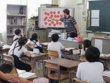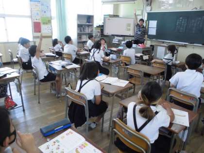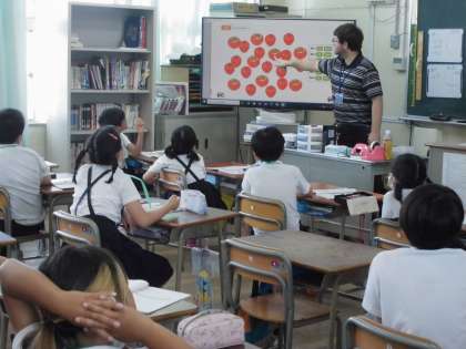 テレビに映った果物の数を英語で答える活動を行っています。映像はすぐに消えるので、みんな集中して数えていました。