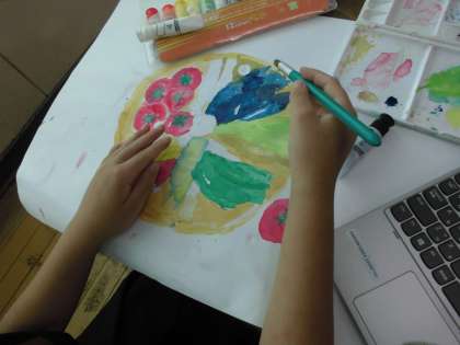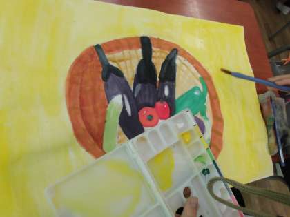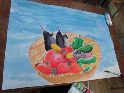 5年生図画工作では絵具を使って、夏野菜を描くことに挑戦しています。野菜に光があったっている様子など細かいところまで絵具で描き表すことが出来ました。