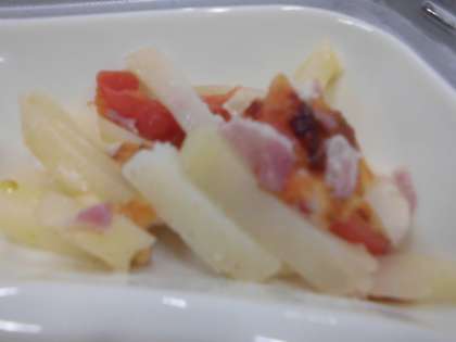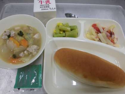 今日の給食は、鶏肉とてぼ豆のスープ煮、じゃがいもとトマトのチーズ焼き、グリーンアスパラガスととコーンのサラダ、リンゴジャム、コッペパン、牛乳です。トマトには、ビタミンCやカロテンが含まれています。これは、皮膚やのど、鼻の粘膜をじょうぶにし、体の抵抗力を高めます。また、食物せんいも豊富で、お腹の掃除をします。今日の「じゃがいもとトマトのチーズ焼き」には、生のトマトが使われています。