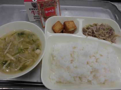 今日の給食は、ゴーヤチャンプルー、五目汁、あつあげのしょうが醬油かけ、ごはn、牛乳です。ゴーヤチャンプルーの「チャンプルー」とは沖縄県の方言で「ごちゃまぜ」という意味で、いろいろな食材をいためた料理です。今日の給食は、夏が旬の野菜である「にがうり(ゴーヤ)」を使った、ゴーヤチャンプルーです。