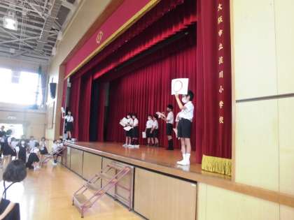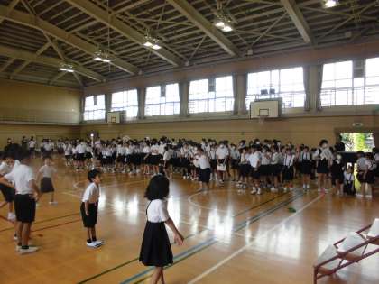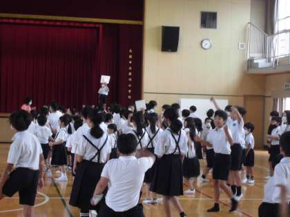 」と集会委員会さんから言われるたびに〇か×か考えて動きます。正解をいわれるたびに、「イェーイ!」と歓喜の声が体育館中に響いていました。