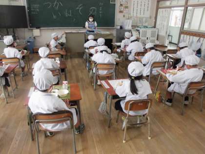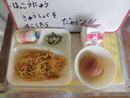 今日の給食は、1/2黒糖パン、、牛乳、チキントマトスパゲッティ、キャベツとひじきのドレッシング、発酵乳です。発酵乳は、牛乳を乳酸菌で発行させて作ります。発酵乳に含まれるカルシウムには、ほねや歯を作る働きがあります。