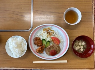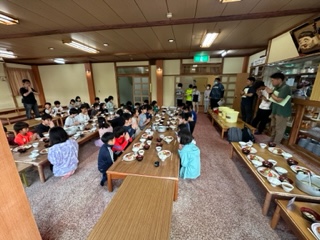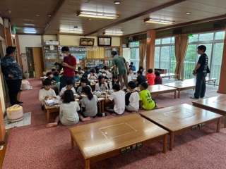 お風呂が終わり、夕食の時間です。これからキャンプファイヤーがあります。ハンバーグ定食を美味しく食べましょう。