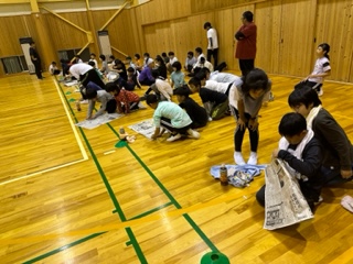 室内オリンピックの新聞紙リレー、マラソン、やり投げの様子です。