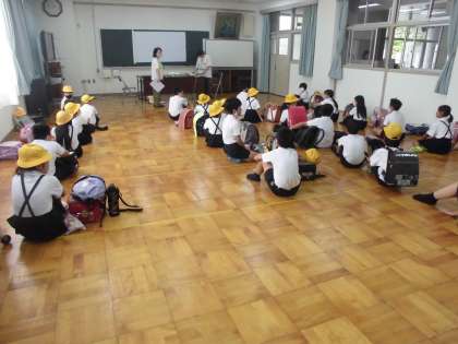 近畿地方に大きな台風が接近し、緊急で一斉下校をするという想定で避難訓練を行いました。子どもたちは、放送や先生の指示をよくきいて行動することが出来ました。また高学年は低学年児童を気遣う姿が微笑ましいく思いました。最後に校長先生から台風時の避難訓練の仕方についてご講話いただき、集団下校を行いました。