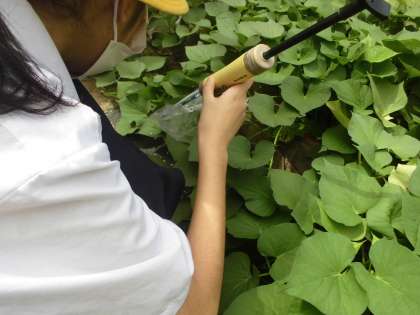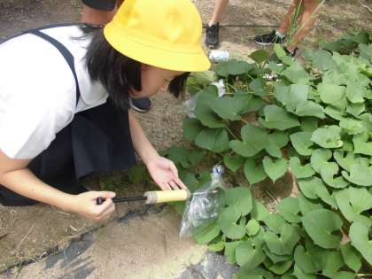 学習園で、植物が日光に当たると、二酸化炭素の割合がどのように変化するのを調べる実験を行っています。気体検知管を上手に使って実験を行いました。