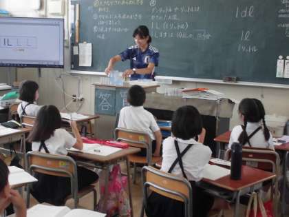 水のかさのお勉強です。1Lますは、10dLの何杯か?について、先生が実際に実験をして確かめました。