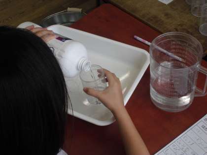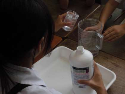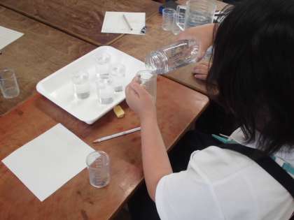 水のかさの学習です。入れものに入る水のかさを予想してから確かめようの学習です。身の回りにあるいろいろな入れ物に水を入れて、そのかさを調べました。
