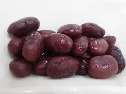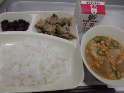 今日の給食は、豚肉の甘辛焼き、とうがんのみそ汁、金時豆の煮物、ごはん、牛乳です。金時豆は、いんげん豆のなかまです。色は濃い赤むらさき色をしています。たんぱく質のほか、炭水化物、おなかの調子を整える食物せんいなどを多く含んでいます。また、ビタミンB1やビタミンB2、貧血をふせぐ鉄なども含まれています。