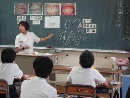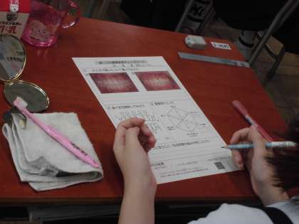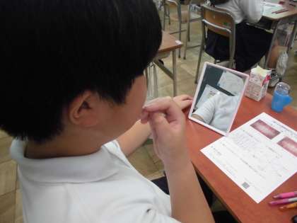 歯科衛生士さんがいらっしゃり、6年生に「歯と口の健康教室」を行ってくださいました。健康な歯と歯茎の写真と歯周病になった歯と歯茎の写真を見比べて歯垢と歯周病の関係を学びました。今朝、歯をみがいてきた人がほとんどですが、みんなの歯には歯垢が残っていないか歯石染色液を使って調べました。