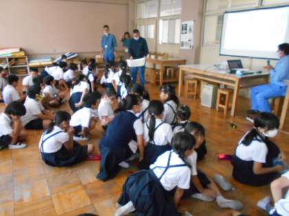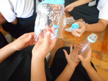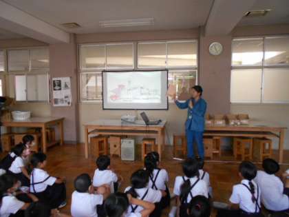 次の時間は、ごみの分別の大切さについて学びました。大阪市のごみは年間だいたい86万トン。少しでもごみを減らすために、リュース・リデュース・リサイクルについて教えていただきました。