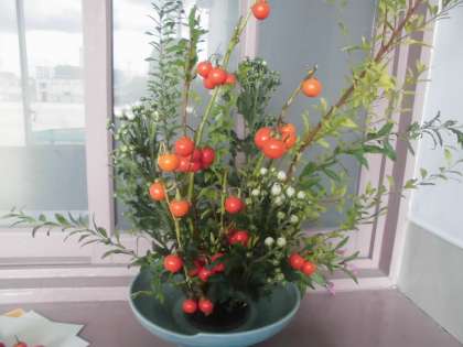 木は「雪柳」、白い花は「小菊」、トマトの実かと思いましたが、スーパークラブという実だそうです。実は、ナス科です。