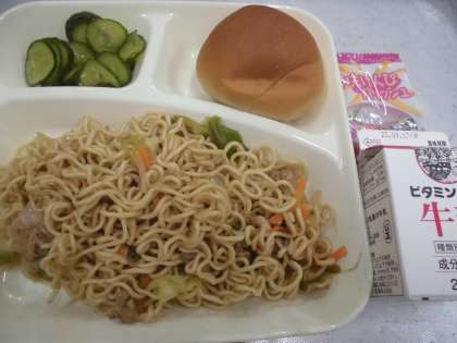 今日の給食は、焼きそば、きゅうりのしょうがづけ、いもけんぴフィッシュ、1/2黒糖パン、牛乳です。「いもけんぴフィッシュ」は国産のかたくちいわしとサツマイモを使っています。今回はじめて給食に登場しました。歯ごたえがあるのでしっかりよく噛んで食べましょう。また、牛乳パックのパッケージも新しくなりました。