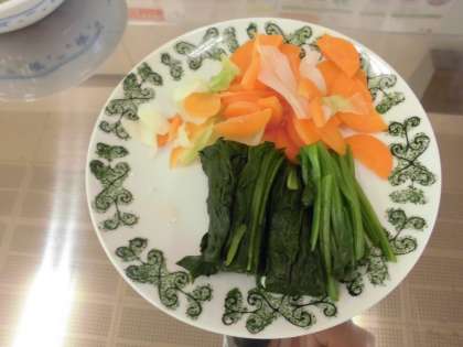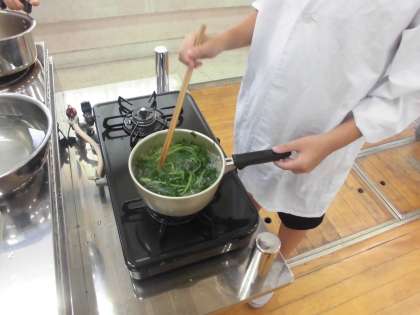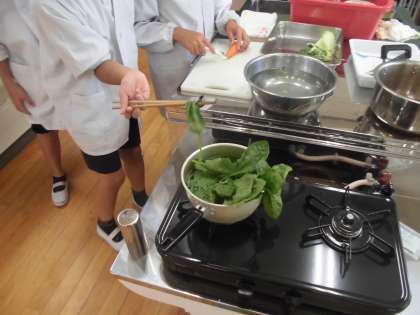 切った食材をいよいよゆでていきます。強火や中火など、火加減を 教科書を見ながらゆでていきます。一番下の写真は、完成したゆで野菜サラダです。盛り付けも工夫しました。いただきまーす!