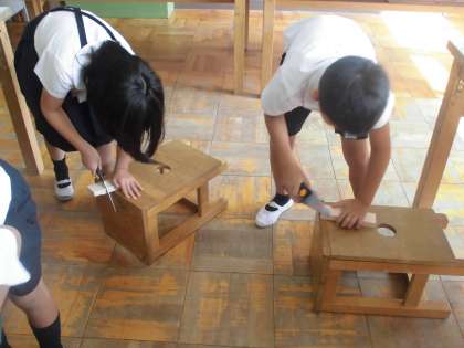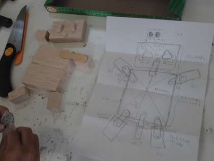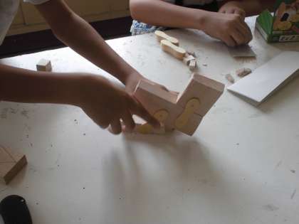 「トントン つないで!」という教材です。のこぎりや金づちを使って木を切ったりつないだりする活動です。各自設計図をもとに、上手につなぎ合わせています。