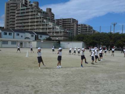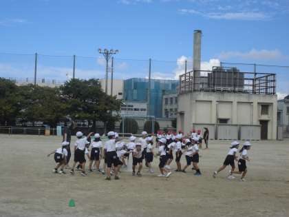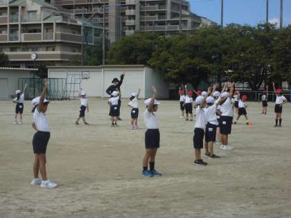 みんな元気いっぱい、1年生のジャンボリミッキーの曲でダンスをしています。見ている方もうきうきわくわくしまね。曲がとまると、玉入れをします。