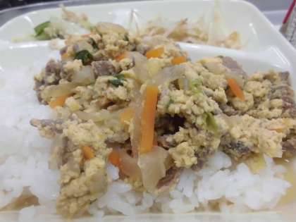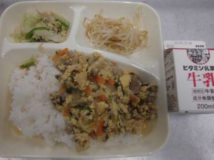 今日の給食は、他人丼、ささみと野菜のいためもの、もやしの甘酢あえ、牛乳です。他人丼は、鶏肉以外の肉(牛肉や豚肉など)と玉ねぎを甘辛く煮たものを、卵でとじてごはんの上にのせた料理です。鶏肉と卵は親と子なので親子丼、牛肉や豚肉などと卵は他人なので、他人丼と名付けられたと言われています。