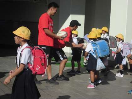本日、出前授業していただく「NTTドコモ レッドハリケーンズ」の皆さんが朝子どもたちへ校門に立って元気よくあいさつしてくださいました。大きな体のラグビー選手を前に少しびっくりした様子ですが、すぐに打ち解けてボールを触らせていただいたりタックルをさせていただいたり朝から大盛り上がりでした。
