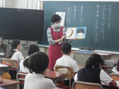 けまQさんが今日は5年生に絵本の読み聞かせに来てくださいました。集中してお話をきくことができました。